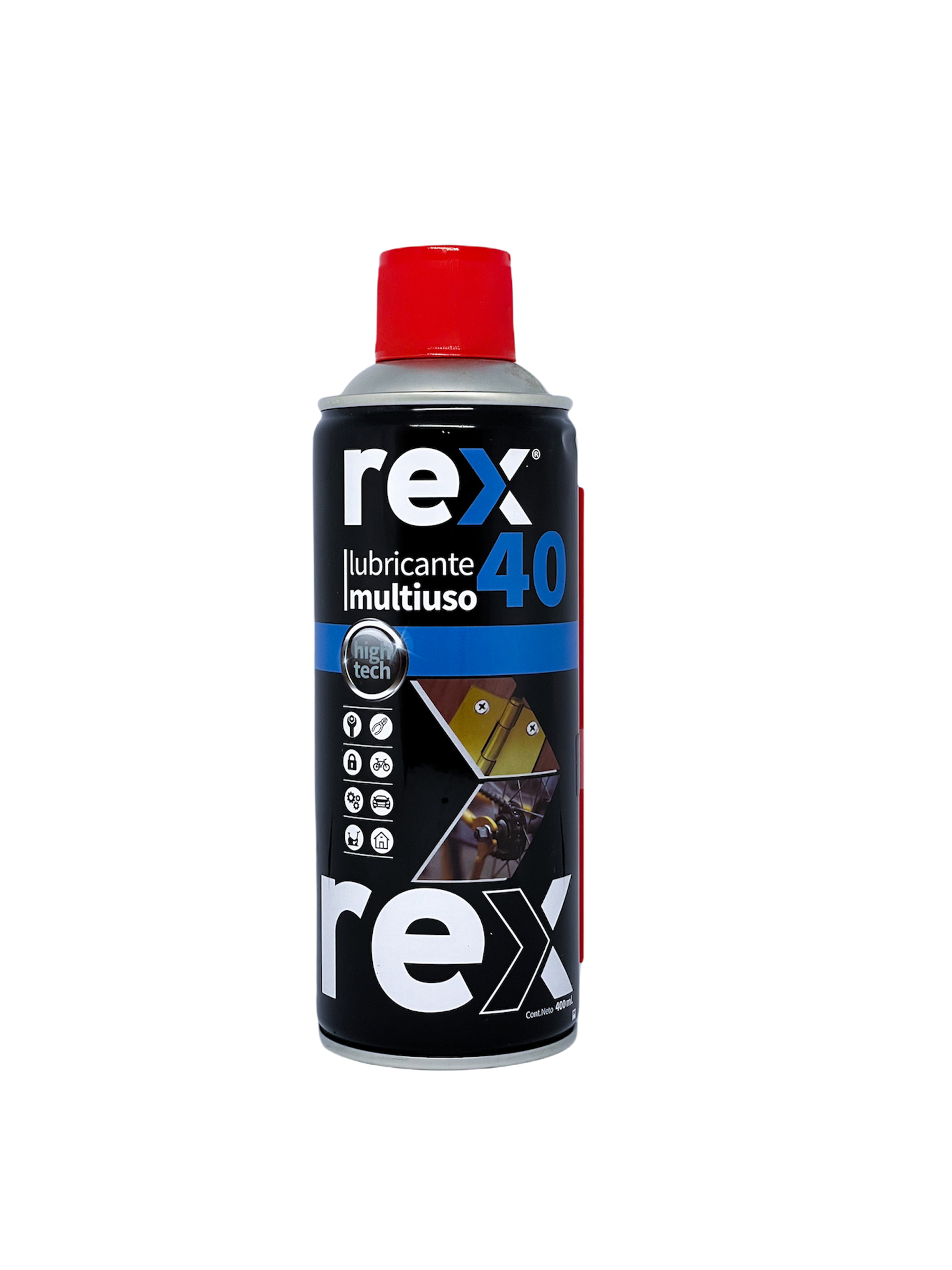 Rex Lubricante 40, es un desengrasante con alto poder de lubricación y protección contra la humedad y la corrosión. Dada su formulación, posee un poder de penetración que le permite actuar agresivamente sobre el oxido. Evita el trabamiento de engranajes, piezas y roscas metálicas y facilita la separación de elementos trabados.