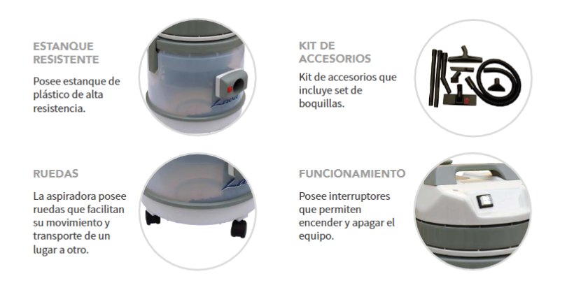 – Cuenta con un kit de accesorios profesionales para la aspiración de polvo y agua.