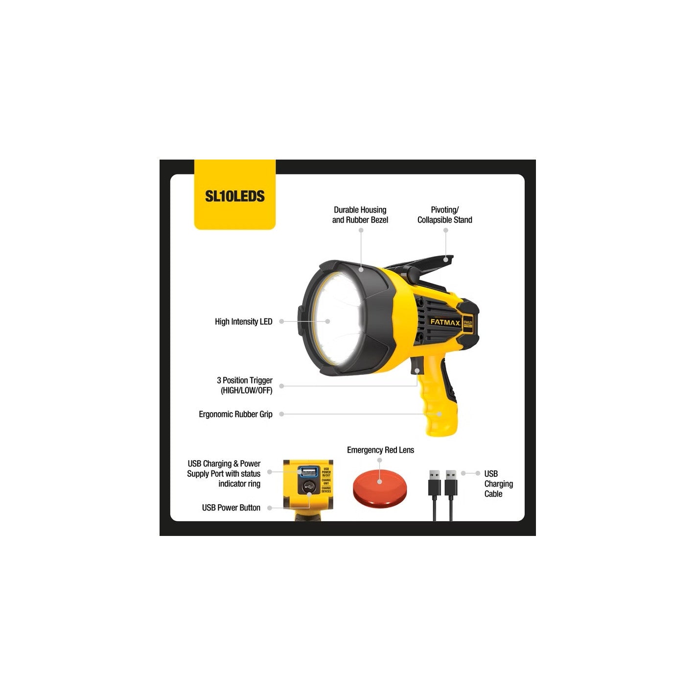 Ilumina donde otros no llegan con la linterna recargable Stanley Fatmax SL10LEDS. Su potente LED de 10W alcanza hasta 2200 lúmenes, ideal para emergencias, camping o trabajos en exteriores. Ofrece hasta 7 horas de autonomía y su batería de ion de litio mantiene la carga por hasta 12 meses. Incluye cargador para auto y casa, lente roja de emergencia y puerto USB para cargar dispositivos. Su diseño ergonómico con mango tipo pistola, soporte pivotante y bloqueo de gatillo permite uso sin manos.