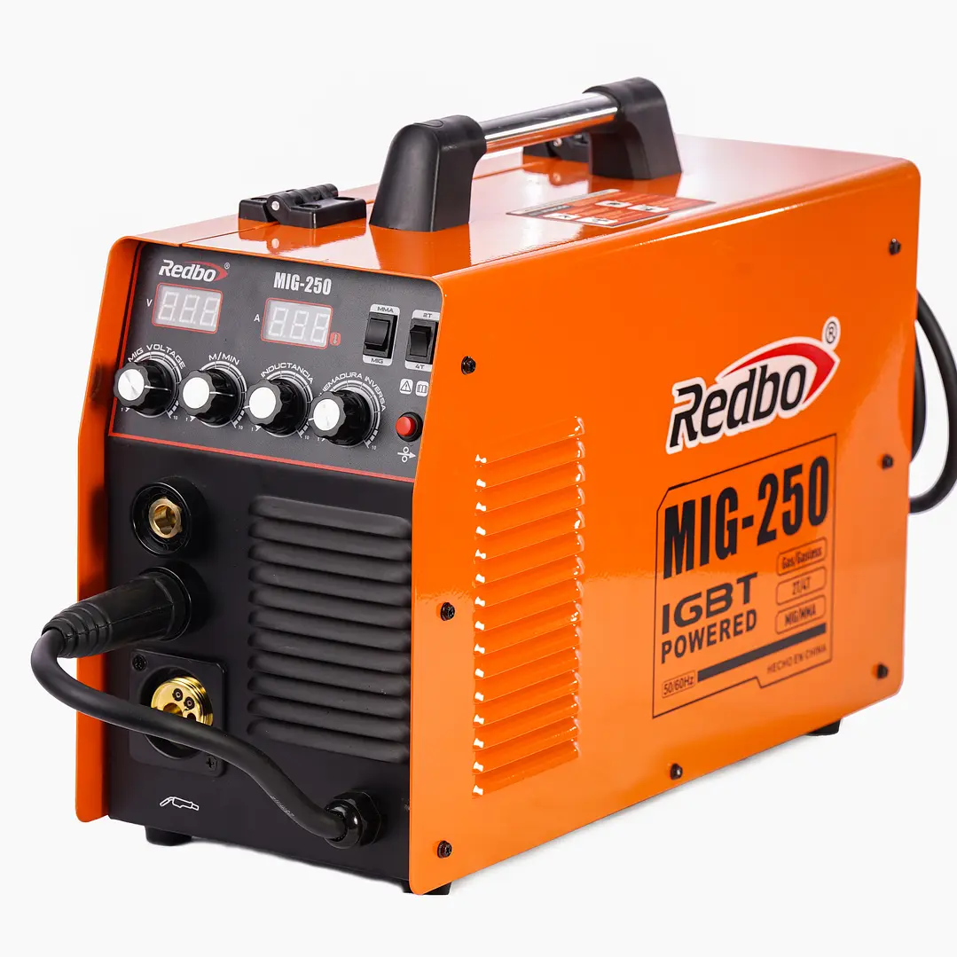 La soldadora Redbo MIG-250/5kg es una soldadora profesional semi-automática, con función 3 en 1, ya sea para soldar con gas, sin gas (GASLESS), para soldar por arco manual (MMA), y para soldar con la función LIFT TIG (al raspado). El arco se inicia al tocar la placa soldada y el alambre de soldadura. Puede ser utilizada con alambres con gas y flux (sin gas). Es capaz de trabajar con todo tipo de acero al carbono normal, acero inoxidable u otros metales. Al ser de un tamaño compacto y ligero permite un transporte sin complicación. Posee display digital, control de un solo comando, para ajustar la corriente con precisión y concentrar mejor el arco. Al terminar, la máquina sigue soplando entre 3 a 5 segundos de forma automática, lo que permite una costura más perfecta. Implementa la máxima profundidad de soldadura de fusión contra placas medias y gruesas. La regulación de un solo comando permite que la operación sea fácil y eficiente.