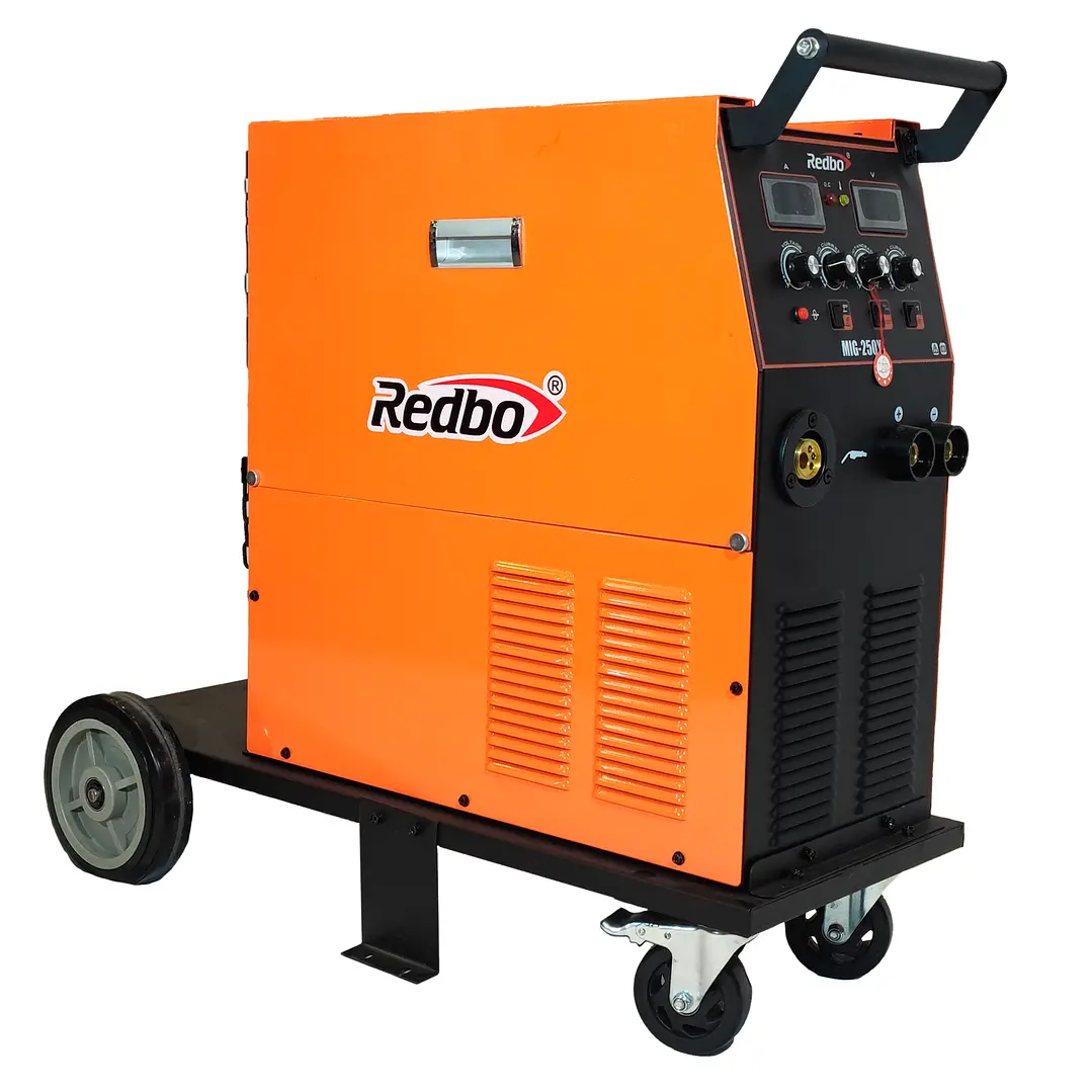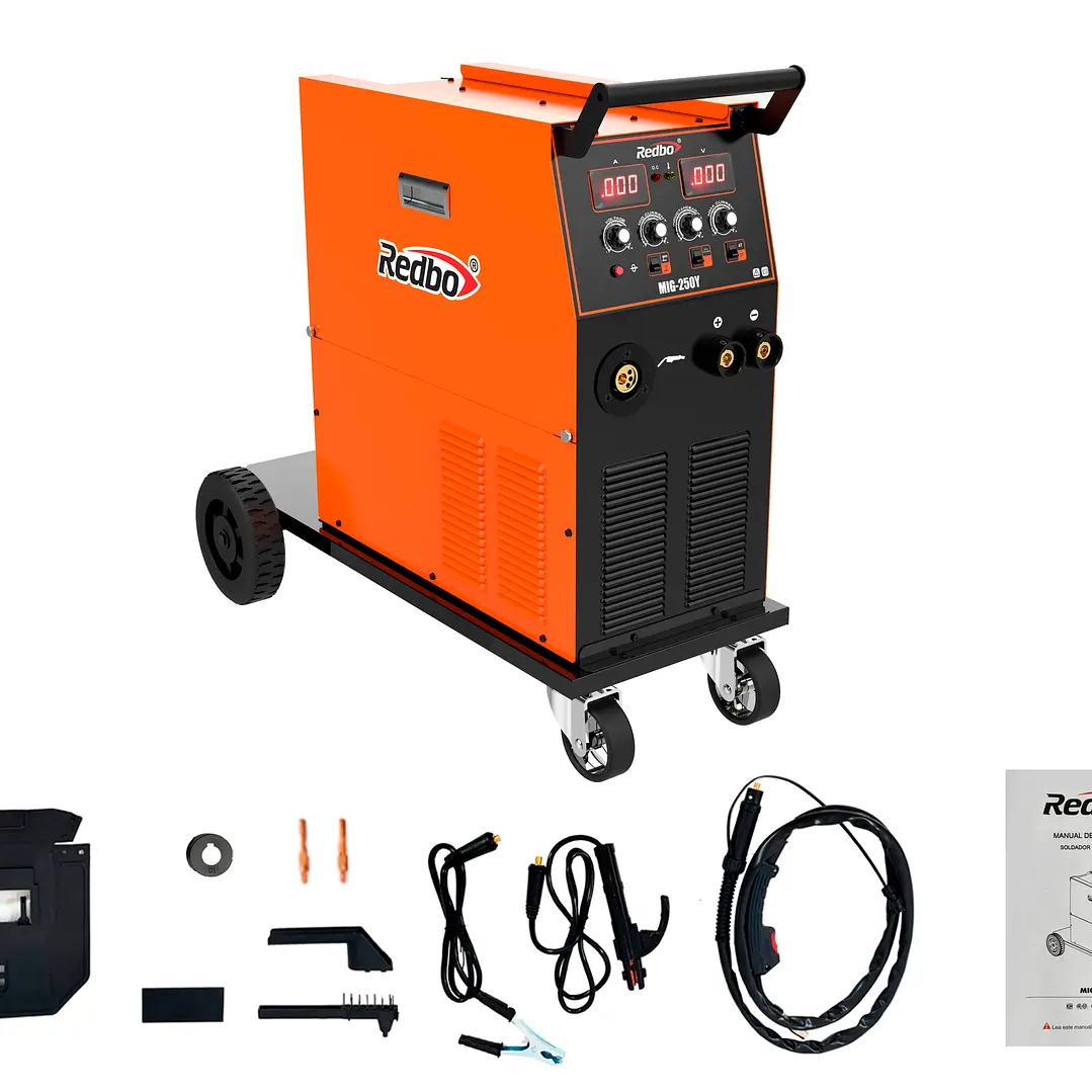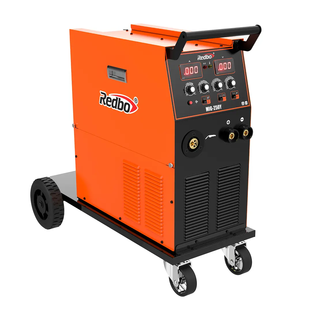 La soldadora redbo MIG-250Y es una soldadora profesional semi automática, con función 2 en 1, ya sea para soldar sin gas (GASLESS), o para soldar por arco manual (MMA). Está diseñada para profesionales que realizan procesos de soldaduras con alambres flux. Es capaz de trabajar con todo tipo de aceros al carbono normal, acero inoxidable u otros metales. Al ser un tamaño compacto y ligero permite un transporte sin complicación. Posee display digital control de un solo comando, para ajustar la corriente con precisión y concentrar mejor el arco. Al termina, la máquina sigue somplando entre 3 a 5 segundos de forma automática, lo que permite una costura más perfecta. Implementa la máxima profundidad de soldadura de fusión contra placas medias y gruesa. La regulación de un solo comando permite que la operación sea fácil y eficiente. Tiene un factor de potencia de 0,93, una tensión en vacío de 52 V.